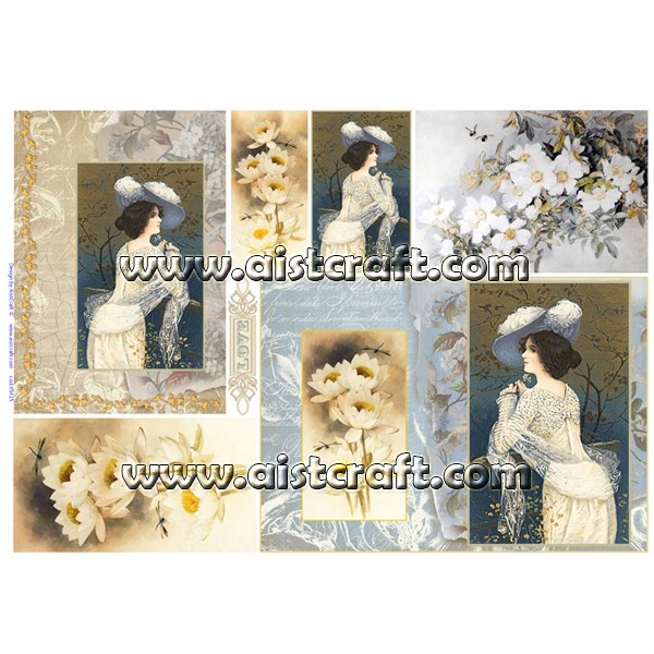 Papier de riz décoré AistCraft. Le papier de riz est tout aussi fin qu'une serviette, mais beaucoup plus résistant. Sa composition amène des petites fibres, ce qui le rend plus attrayant son utilisation dans la décoration de tout type d'objets. A couper ou déchirer et appliquer sur toutes les surfaces avec colle pour la technique de Découpage. 28 g