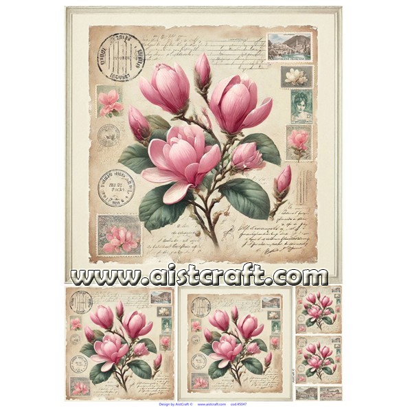 Papier de riz décoré AistCraft. Le papier de riz est tout aussi fin qu'une serviette, mais beaucoup plus résistant. Sa composition amène des petites fibres, ce qui le rend plus attrayant son utilisation dans la décoration de tout type d'objets. A couper ou déchirer et appliquer sur toutes les surfaces avec colle pour la technique de Découpage. 28 g